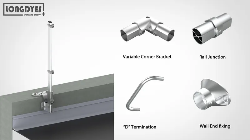 | Caratteristiche | La parentesi d'angolo variabile (montaggio variabile di angolo) è Adatta per connettere due rotondi Corrimani del metallo nelle applicazioni ad angolo variabili. È Fissato usando una giuntura/giunzione della guida a la una o la altra estremità E dovrebbe essere perforato e rivettato per fissare sul posto. | La parte della giuntura o della giunzione della guida è Usata per connettere due sezioni del corrimano o del kneerail. Un anello di spinta situato al centro della parte della giunzione assicura che sia installato sempre centralmente fra le due metà Unentesi. | L'estremità Terminale della guardavia ha riparato entrambi i lati della guardavia per connettere il corrimano al kneerail ed unirsi due giunzioni della guida. Dovrebbe essere perforata e rivettata al corrimano e al kneerail per assicurare la riparazione quando il termine è Presupposto | Ha usato per connettere la parte di estremità Della parete del sistema modulare di alluminio della guardavia ad una struttura fissa (per esempio la parete) alla stabilità Supplementare di garanzia per il sistema senza l'esigenza dei contrappesi supplementari sugli alberini dritti finali |