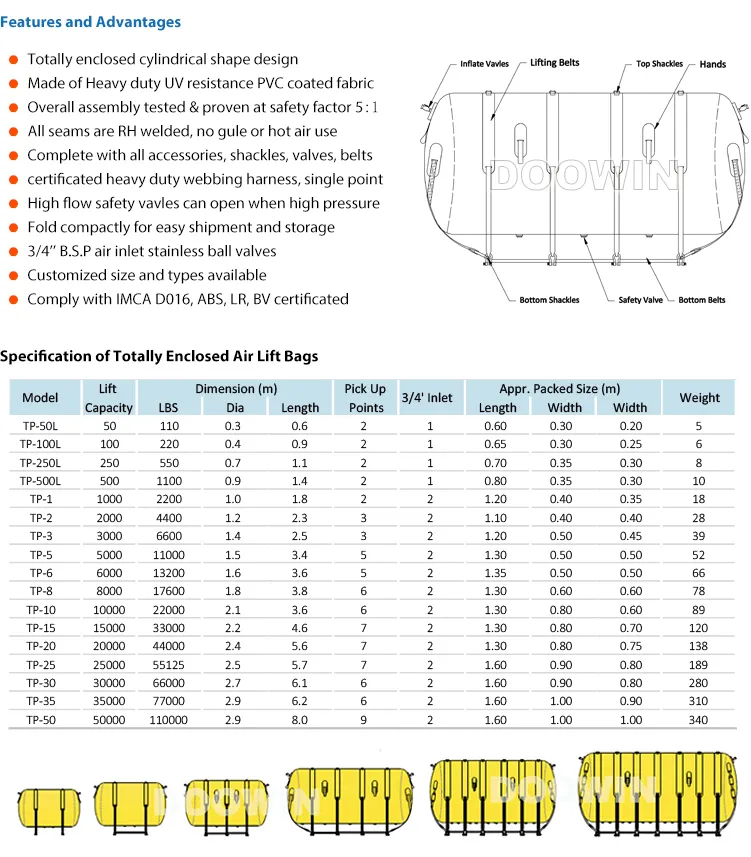 I sacchetti completamente inclusi della pompa ad aria compressa possono essere usati per il supporto di galleggiabilità Ed il funzionamento di refloatation in acque basse e sulla superficie, sui pontoni salvataggio/di sostegno per i ponticelli, sulle piattaforme di galleggiamento, sui cancelli di bacino, sugli oggetti sunken o sulle attrezzature militari. I sacchetti di sollevamento dell'aria completamente inclusa offrono un metodo effectual di riduzione della cambiale dell'imbarcazione e di fare galleggiare le strutture subacquee. Allora egualmente fornire un sistema ideale di galleggiabilità Per cavo o conduttura e supporto statico di galleggiabilità
